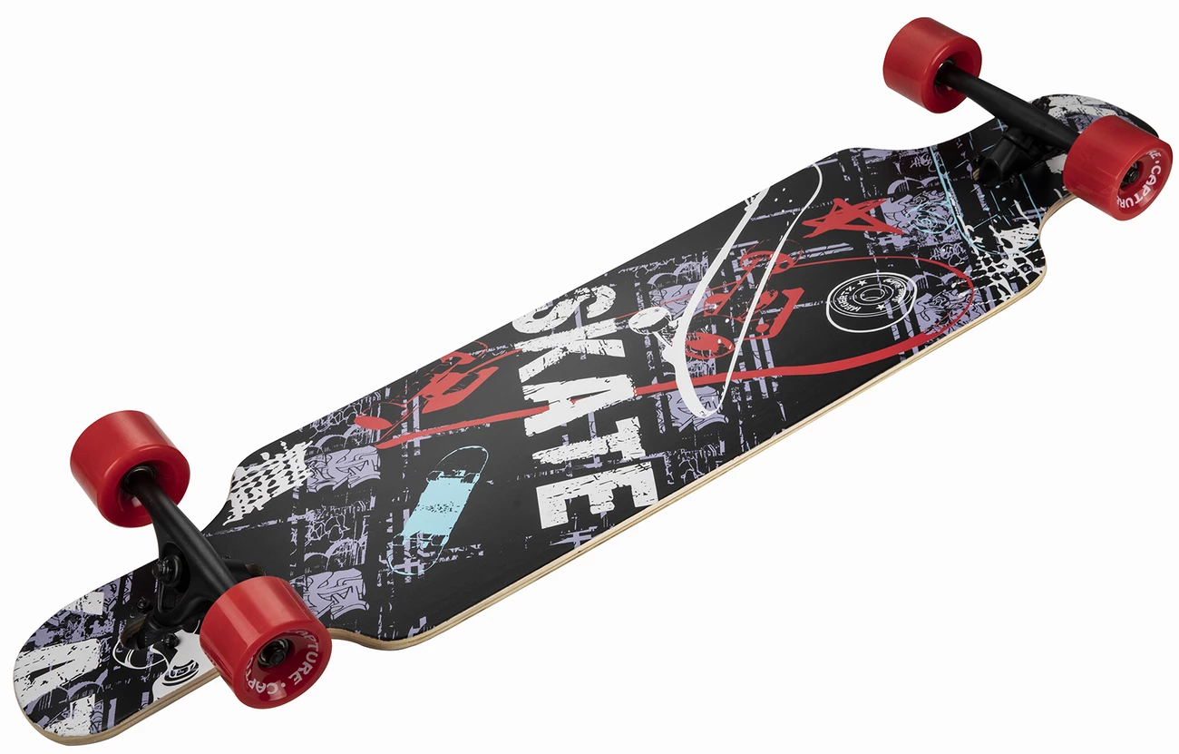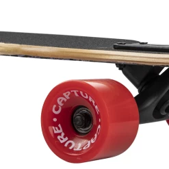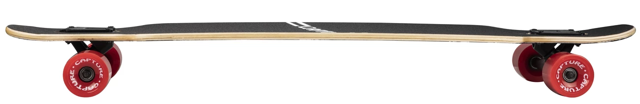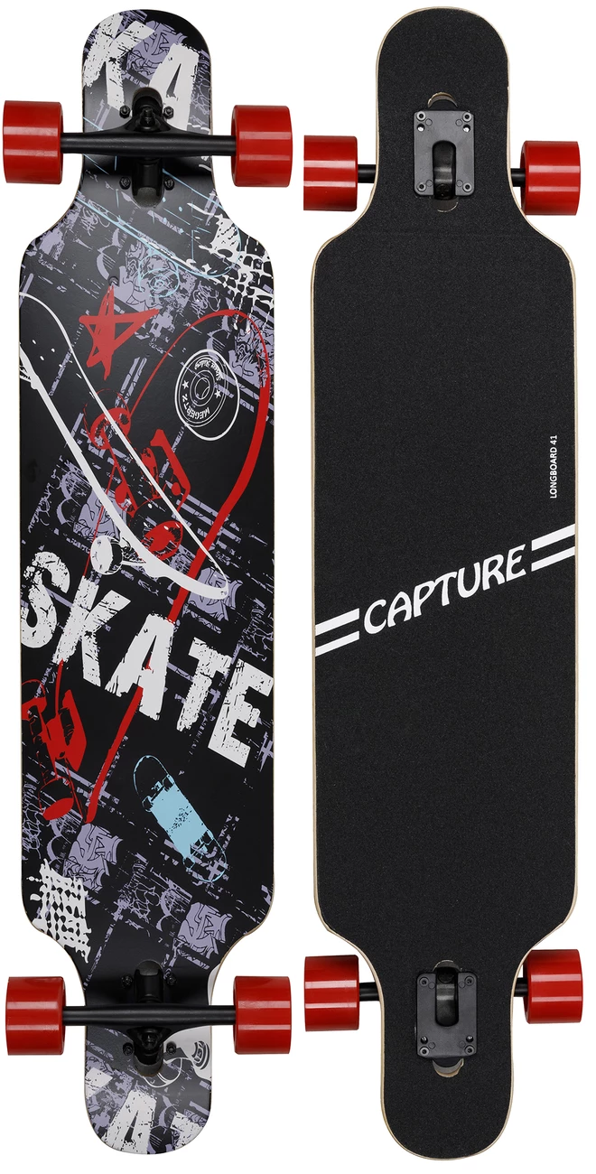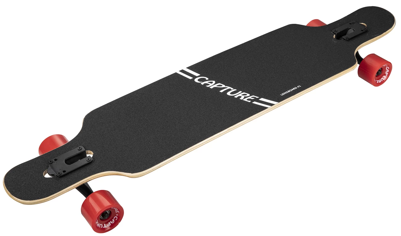 Capture Outdoor, Freeride Carving “Longboard 41″, 104x24cm, 41×9.5”, forme “Drop”, en bois d’Erable Canadien, 8 couches, alliant stabilité, agilité et durabilité. La forme “Drop” abaisse le centre de gravité, accentue les virages et la maniabilité. La planche, proche du sol, permet de faciliter les efforts à la poussée. “Trucks” avec montage inversé pour accentuer les virages et la réactivité. Le Grip est noir. La rigidité du “Deck” est de catégorie médium. Les roues de 70x51mm type tunnel, sont de type dureté 82A, en Polyuréthane PU, gomme favorisant confort, et vitesse. Les roulements sont de type ABEC-7, en carbone, pour une bonne qualité de glisse. Les roues sont montées sur des Trucks en Aluminium, essieux de 7.0″. Le plateau noir est antidérapant, et les roues sont rouges. Poids maximum conseillé de 130kg. Le poids du skate est de 3,36kg.